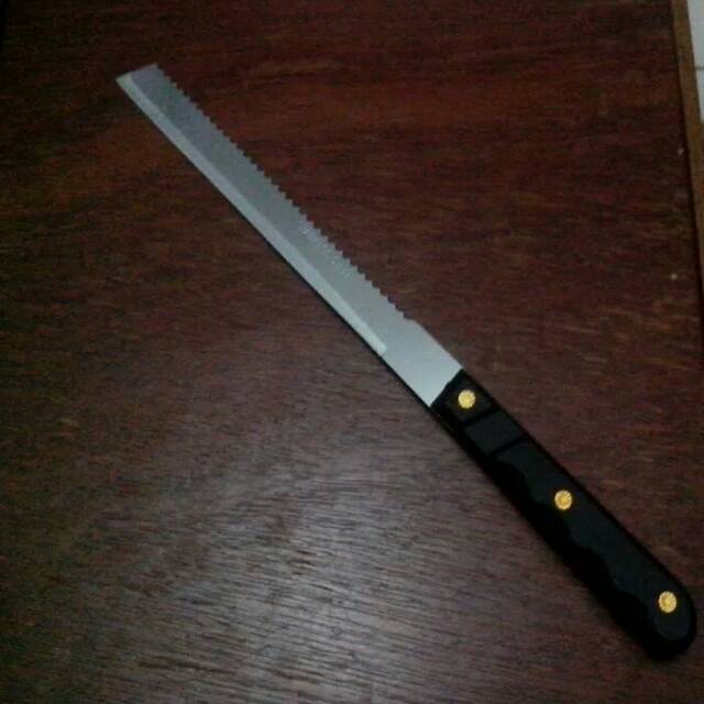 Pisau potong cake atau roti. Terbuat dari stainless stell bergagang plastik berpatri yang kuat dan kokoh. Terdapat dua mata pisau. Satu sisi bergerigi sebagai pemotong roti dan sisi yang lain bermata tajam sebagai pemotong cake atau kue.Panjang keseluruhan pisau 32 cm. Lebar Pisau 2 cm.#pisaucake #pisauduasisi#pisaurotitpisa