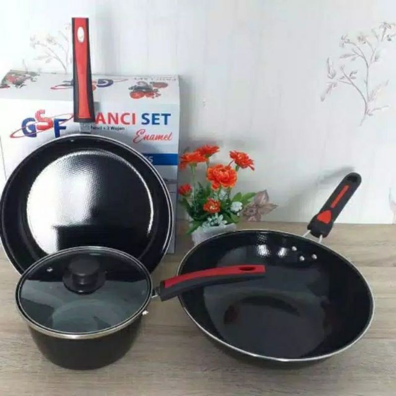 Disaat memasak, bisa menghasilkan hidangan yang lezat akan menciptakan kepuasan tersendiri apalagi kalau momen memasakmu didukung dengan perlengkapan masak yang lengkap. Salah satu peralatan masak yang bisa kamu lengkapi untuk dapur kamu adalah Panci Set. Dengan Panci Set yang lengkap dan terjamin kualitasnya, memasak pasti jadi lebih semangat untuk menghasilkan makanan sehat untuk kamu ataupun juga keluarga.Terbuat dari enamel yang dapat menghantar panas dengan cepat merata serta anti karat.Dilengkapi dengan tutup kaca yang anti panas memudahkan anda untuk melihat masakan dan tingkat kematangan pada masakan yg sedang anda masak.Memasak tanpa menggunakan banyak minyak dan mudah dibersihkan.Dilengkapi elemen yang melekat pada bagian bawah masing - masing untuk mempercepat induksi panas yang dihasilkan kompor serta tidak mudah berkerak, mempercepat proses memasak anda di dapur kuat, mudah di bersihkan serta awetSpesifikasi Produk :Brand : GSF 2630Material : EnamelSet : Panci susu/frypan tutup kaca, Wajan Wok & SaucepanDimensi ukuran masing-masing :- Panci susu/frypan tutup kaca ; Diameter 18 cm- Wajan Wo : Diameter 30 cm- Saucepan : Diameter 26 cmWarna : hitam enamelDimesni dus box : 31 x 15.5 x 31 cmDilengkapi handle anti panas memudahkan anda mengangkat perlatan ini dalam proses memasak anda di dapur. wajib dimiliki panci set enamel guna keperluan memasak di dapur praktis , cepat mudah dibersihkan dan awet serta anti karatDisaat memasak, bisa menghasilkan hidangan yang lezat akan menciptakan kepuasan tersendiri apalagi kalau momen memasakmu didukung dengan perlengkapan masak yang lengkap. Salah satu peralatan masak yang bisa kamu lengkapi untuk dapur kamu adalah Panci Set. Dengan Panci Set yang lengkap dan terjamin kualitasnya, memasak pasti jadi lebih semangat untuk menghasilkan makanan sehat untuk kamu ataupun juga keluarga.Terbuat dari enamel yang dapat menghantar panas dengan cepat merata serta anti karat.Dilengkapi dengan tutup kaca yang anti panas memudahkan anda untuk melihat masakan dan tingkat kematangan pada masakan yg sedang anda masak.Memasak tanpa menggunakan banyak minyak dan mudah dibersihkan.Dilengkapi elemen yang melekat pada bagian bawah masing - masing untuk mempercepat induksi panas yang dihasilkan kompor serta tidak mudah berkerak, mempercepat proses memasak anda di dapur kuat, mudah di bersihkan serta awetSpesifikasi Produk :Brand : GSF 2630Material : EnamelSet : Panci susu/frypan tutup kaca, Wajan Wok & SaucepanDimensi ukuran masing-masing :- Panci susu/frypan tutup kaca ; Diameter 18 cm- Wajan Wo : Diameter 30 cm- Saucepan : Diameter 26 cmWarna : hitam enamelDimesni dus box : 31 x 15.5 x 31 cmDilengkapi handle anti panas memudahkan anda mengangkat perlatan ini dalam proses memasak anda di dapur. wajib dimiliki panci set enamel guna keperluan memasak di dapur praktis , cepat mudah dibersihkan dan awet serta anti