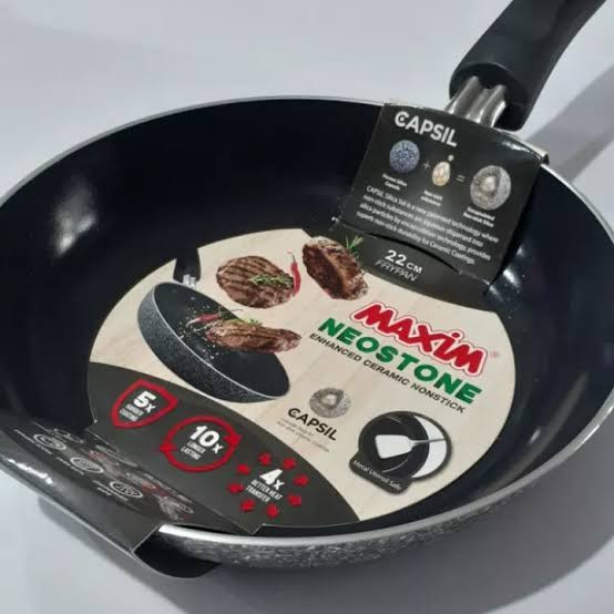 Wajan Fry Pan 22Cm MAXIM NEOSTONE CAPSIL Anti Lengket Marble CeramicMaxim frypan neostone alat masak dengan lapisan teflon anti lengket dan exterior berupa marble Keramik, alat masak ini tidak mudah panas karena terbuat dari bakelite sehingga aman digunakan.Diameter wajan : 22 CmBerat Aktual 385 GrFitur:⦁ Interior: Black Diamond⦁ Exterior: Ceramic⦁ Color: Hitam⦁ Handle: Bakelite⦁ Oven Safe: Yes, up to 176 C degree⦁ Dishwasher Safe: Yes⦁ 5X Harder Coating⦁ 10X Longer Lasting⦁ 4X Better Heat Transfer⦁ Aman dari Metal Turner/Utensils⦁ Bisa buat Kompor Listrik, Halogen, Gas Stove, Ceramic Stove, Oven Safe⦁ Metal Utensils