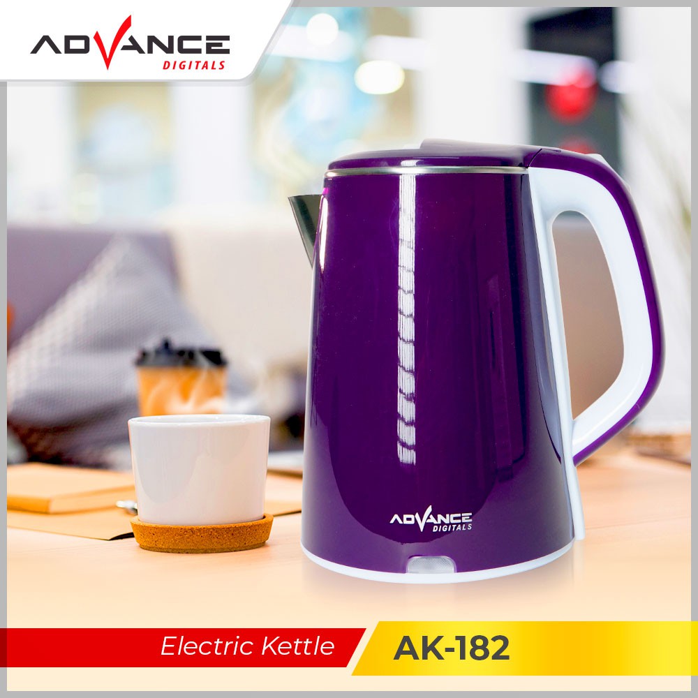 Advance Teko Electric Kettle AK182 Garansi 1 TahunKapasitas 2 LiterstainlessBerputarKabel Gulungwarna merah dan ungu500 wattAdvance Electric Kettle 2 liter adalah perpaduan sempurna antara desain yang elegan dan fungsi yang maksimal. Dengan bagian dasar yang terbuat dari stainless steel membuat ketel ini menjadi lebih tahan lama dan mudah digunakan. Advance Ketel Elektrik yang membutuhkan daya Watt ini dilengkapi dengan lampu indikator transparan dan tombol on/off. Dengan daya sebesar ini memasak air menjadi lebih cepat. sehingga dapat menghemat waktu dan listrik.Stainless SteelDengan material yang terbuat dari stainless steel yang berkualitas. ketel ini awet dan tidak mudah rusak. selain itu tahan panas.Kapasitas BesarAdvance Ketel Elektrik ini berkapasitas 2 liter membuat Anda tidak perlu berkali-kali merebus air untuk menyeduh teh atau kopi. ataupun menyiapkan minuman ataupun makanan yang membutuhkan air panas.FiturBuka / tutup menggunakan tombol. sistem proteksi ganda yaitu otomatis OFF (mati) jika air sudah mendidih atau tanpa air. penempatan pada alas derajat. elemen pemanas tersembunyi. penyimpanan kabel yang praktis (kabel bisa digulung pada bagian bawah / alas ketel.PerawatanUntuk membersihkan ketel agar lebih bersih. isi dengan air cuka lalu rebus selama hingga menit. Untuk pembersihan bodi luar. gunakan lap basah. Kosongi dan bersihkan setelah kali pemakaian untuk merebus air. Selalu cabut steker kabel listrik dari stop kontak bila tidak ter