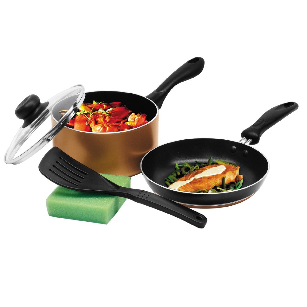 Satu set alat masak yang terdiri dari 1 buah panci + tutup kaca + 1 buah wajan + 1 buah spatula dan 1 buah spons. Interiornya terbuat dari lapisan teflon anti lengket, gagang anti panas, dan terbuat dari alumunium yang dapat mendistribusikan panas dengan baik dan merata. Peralatan masak ini juga memiliki pegangan yang kuat sehingga Anda dapat memasak dengan aman dan nyaman.Bahan TeflonSaru set alat masak ini terbuat dari teflon yang berkualitas, dan dapat mendistribusikan panas dengan baik. Sehingga masakan Anda dapat matang dengan merata. Selain itu peralatan masak ini mudah dibersihkan, karena materialnya yang anti lengket dan tidak berkarat.Manfaat dan kegunaanSatu set alat masak ini sangat cocok untuk melengkapi peralatan masak Anda. Terdiri dari satu buah panci yang digunakan untuk memasak masakan berkuah dan merebus makanan favorit Anda. Juga satu buah wajan yang digunakan untuk menggoreng dan men