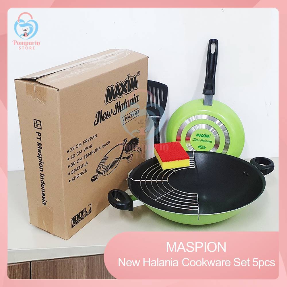 MASPION Maxim New Halania 5pcs SetCookware Set berkualitas isi 5pcs,Terdiri dari :- Wajan Frypan 22cm 1unit- Wok 30cm 1unit- Tempura Rack 30cm 1unit- Spatula 1unit- Sponge Cuci 1unit- Berat Bersih 2300grProduk Non Garansi⭐Open Order 24 Jam⭐Order masuk sebelum pukul 14.00 dikirim hari yg sama (kecuali minggu/tgl merah/overload)⭐Tambahkan (Add to cart) extra bubblewrap demi tambahan keamanan paket kakak.⭐Produk sebelum kirim sudah melalui proses QC dan sudah dipastikan baik dan berfungsi.⭐Jika ada kesalahan produk/kurang barang, wajib melampirkan video unboxing , foto produk dan label pengiriman.⭐Tidak menerima request warna via