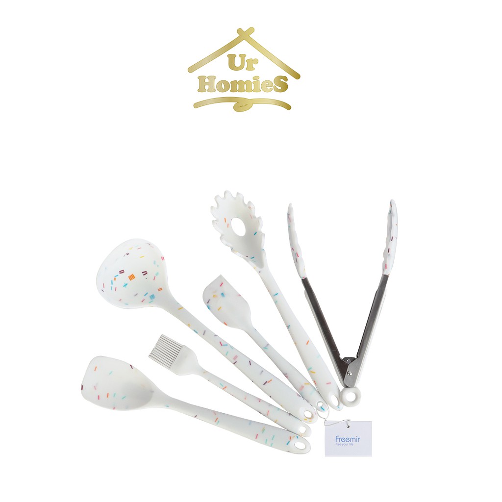 |** PRODUK HABIS** update 1 September 2021Peralatan masak modern anti lengket yang tidak mudah retak dan meleleh saat digunakan untuk memasak. 1 set isi 6 pcs - Sendok sayur : 29 x 9 cm - Penjepit 26 x 5 cm - Sendok spaghetii 28.2 x 5.2 cm - Spatula besar 28 x 6.1 cm - Kuas 20.8 x 3.4 cm - Spatula kecil 20.5 x 4 cm Keunggulan - FDA Approve dan Food grade (sehat dan aman untuk makanan) - Heat resistant / tahan panas -40 - 230°C - Non - Sticky / Tidak Lengket Di Wajan - Mudah dibersihkan - Kuat, tidak mudah berubah bentuk - Anti gores /panci tidak akan tergoser saat digunakan untuk memasak