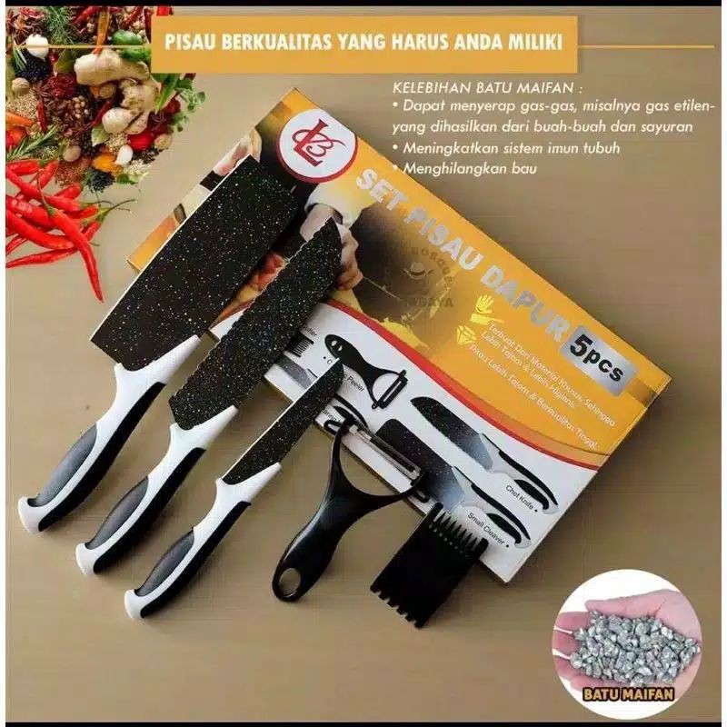 INFO PENTING1. Untuk menambah keamanan barang/paket anda, silahkan menambahkan packing ekstra pada setiap pembelian anda2. Sudah di cek kondisi fisik dan fungsi (tidak pecah, rusak, patah, dll). Komplain barang kurang atau rusak harus disertai bukti video membuka packing. Kerusakan paket dalam pengiriman ekspedisi mungkin dapat terjadi.Spesifikasi: - 5pcs Knife Set ( Pisau Koki, 8" Pisau Roti, 8" Pisau Slice, 5" Pisau Utilitas, 3.5" Pisau Pengupas ) - 1 Pengupas Lapis Keramik.- Gagang dengan campuran batu maifan- Lapisan granit- Non Stick Coating Blade.- Dibuat untuk Koki Profesional.- Kemasan Kotak Cantik.Keunggulan produk:- Dengan mata pisau berbahan dasar Stainless steel yang tajam- Lapisan anti lengket- Pegangan pisau yang tidak licin / anti slip dan ergonomis- Fitur pelindung jari untuk keamanan dan kenyamanan dalam mengenggam- Mata pisau anti bakteri- Lekukan - lekukan di mata pisau, untuk membantu melepaskan bahan makanan yang tipis setelah dipotongCatatan saat menggunakan:- Jangan meninggalkan produk di dekat api- Jangan membersihkan mesin cuci piring- Jangan mengambil risiko menggunakan tangan Anda untuk menguji ketahanan pisau Anda untuk menghindari cedera- Jauhkan produk dari jangkauan anak-anak- Bersihkan dan keringkan produk setelah digunakan untuk menghindari karat- Hanya gunakan tujuan dasar#NB : Barang ini tidak bergaransi sehingga tidak bisa retur (pengembalian barang).Ikuti toko kami untuk mendapatkan promo menarik dan lebih mudah mencari untuk berbelanja
