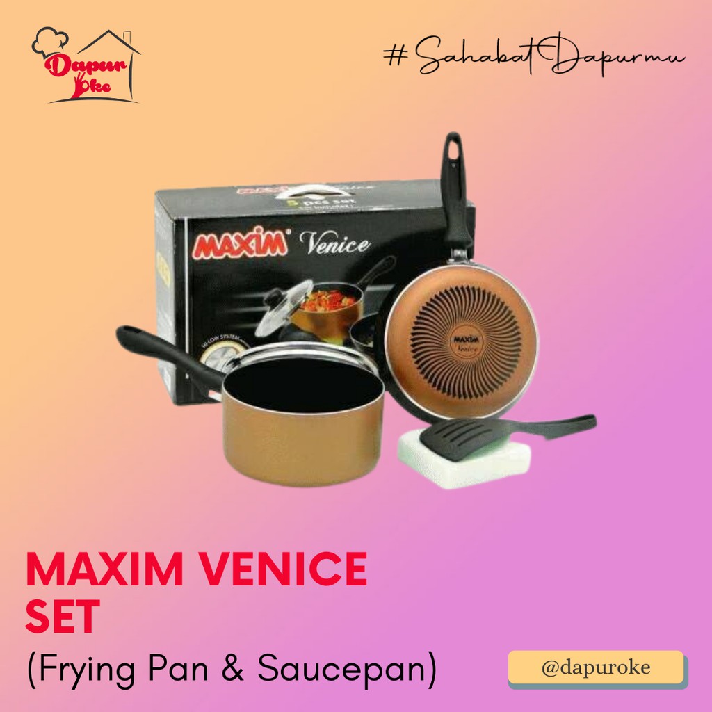 Maxim Venice Set merupakan alat masak yang terbuat dari teflon yang berkualitas dan dapat mendistribusikan panas dengan baik, sehingga masakan Anda dapat matang dengan merata. Selain itu peralatan masak ini mudah dibersihkan karena materialnya yang anti lengket dan tidak berkarat.Dengan model yang unik dan menarik menjadikan kegiatan masak memasak anda menjadi lebih menyenangkan.1 set peralatan masak terdiri dari:* Frypan (diameter 20cm, tinggi 4cm)* Saucepan (diameter 17cm, tinggi 9cm)* Glasscover Saucepan* Spatula* Spongecocok untuk mengisi rumah baru simple, bermanfaat dan el