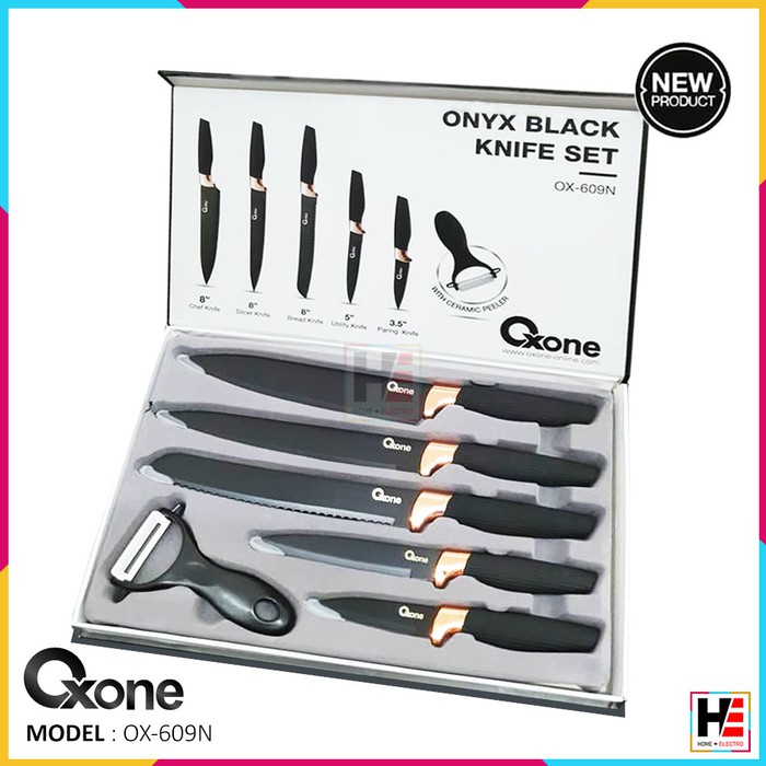 Onyx Black Knife Set Oxone OX-609NPisau Oxone terbaru !!!Kualitas Oxone tidak perlu di ragukan !!!Merk : OxoneTipe : OX-609NKualitas : ORIGINALBerat : 2 Kg# SPESIFIKASI :- 6Pcs Pisau Set- Sangat tajam- Dilengkapi peller ( mata pisau keramik)- Kualitas Stainless anti karat- Desain Elegan# Isi Paket & Ukuran :1pcs chef knife 8"1pcs slicer knife 8"1pcs bread knife 8"1pcs utility knife 5"1pcs paring knife 3.5"1pcs ceramic pe