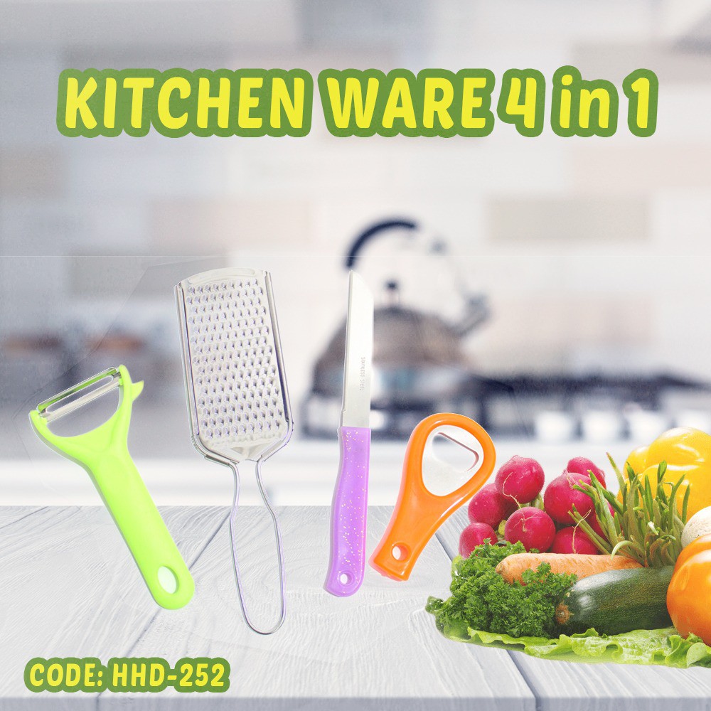KITCHEN WARE 4IN1 - SET PERALATAN MASAK PISAU PARUTAN KEJU - HHD-252Lebih murah , lebih lengkap , lebih hematSet peralatan memasak kitchen ware set 4 in 1 . peralatan memasak lengkap isi 4 variasi peraalatan berbeda dalam 1 kemasan.Isi per pack :Parutan kejuPisauPembuka botolPengupas kentangYuk tunggu apa lagi, lagsung order sekarang juga ya#dapur #peralatan_memasak #pisau #coca_cola #pengupas_kentang #kitchen_set #peraalatan_me