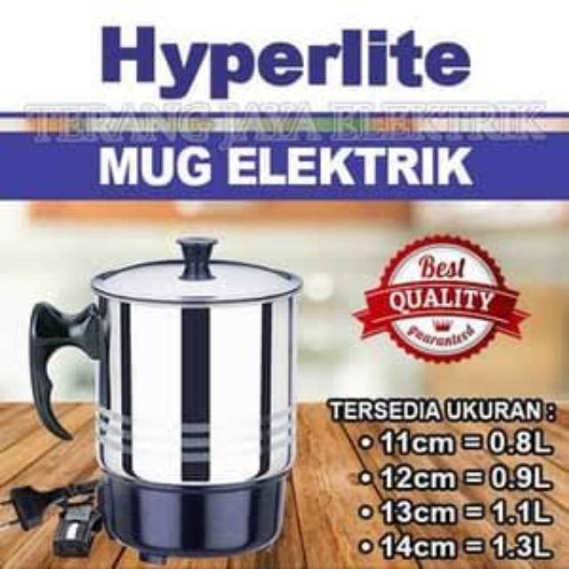 Electric Heating Cup teko (mug) stainless listrik yang dapat digunakan untuk memanaskan atau memasak mie- Electric Heating Cup Hyperlite sangat cocok digunakan untuk kamu yang tak mau repot untuk membuat kopi atau teh saat di kosan, kantor atau rumahSpesifikasi :- Hemat energi- Menampung air banyak- Mempercepat proses memasak- Terbuat dari stainlesstell berkualitas tinggi- Kuat dan tahan lama- Berbahan Stainless Steel - Dilengkapi Kabel Ground - Cocok Digunakan untuk Rumahan Kantor dan anak kos-kosan VARIASI :11CM = 0.75 LITER12CM = 0.9 LITERPetunjuk teknis :1. Ketika sedang memasak makanan atau minuman jangan menggoncang atau memindahkan mug ini untuk menghindari sengatan aliran listrik.2. Jangan mengisi pemanas listrik terlalu penuh ( tidak boleh melebihi 4/ 5 bagian, karena bisa menyebabkan tumpahan setelah mendidih.3. Setelah selesai memasak cabut hubungan listriknya sebelum memindahkan ke wadah lain.4. Jangan merendamkan wadah pemanas listrik ini ke dalam air karena bisa menyebabkan penurunan fungsi kinerja mug.5. Saat produk ini pertamakali digunakan dan dihubungkan dengan arus listrik akan mengeluarkan asap dan bau disebabkan pembakaran sisa-sisa kotoran dan pelapis pada elemen pemanas. Hal ini tidak berbahaya dan alat pemanas ini dapat digunakan normal untuk selanjutnya.Keterangan :Nikita Teko pemanas air sistem heater berbahan dari stainlessteel yang berkualitas tinggi, sehingga dapat mempercepatproses pemanasan aman dan praktis. bahan kuat dan tahan lama. Proses pemakaian mudah dan aman.PACKING14cm X 14cm X 19cm50